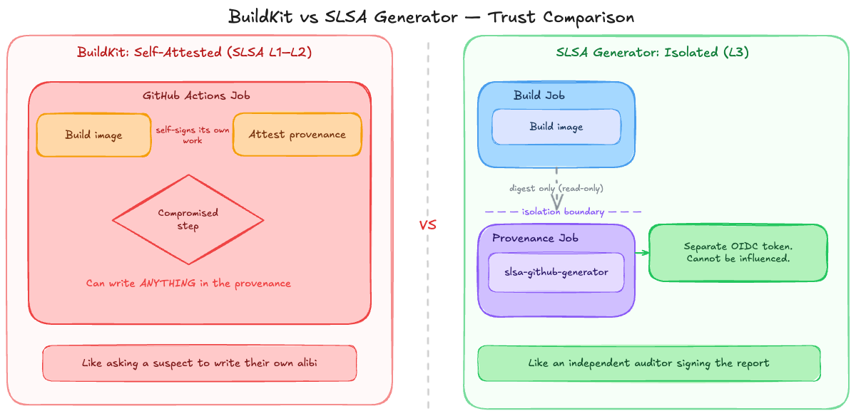 This is where most implementations go wrong, and where most blog posts gloss over the detail that actually matters.docker/build-push-action ships with provenance: true. Enable it, and BuildKit attaches a provenance attestation to your image. It works. It's convenient. It is also self-attested, which means it provides Build L2 guarantees, not L3.