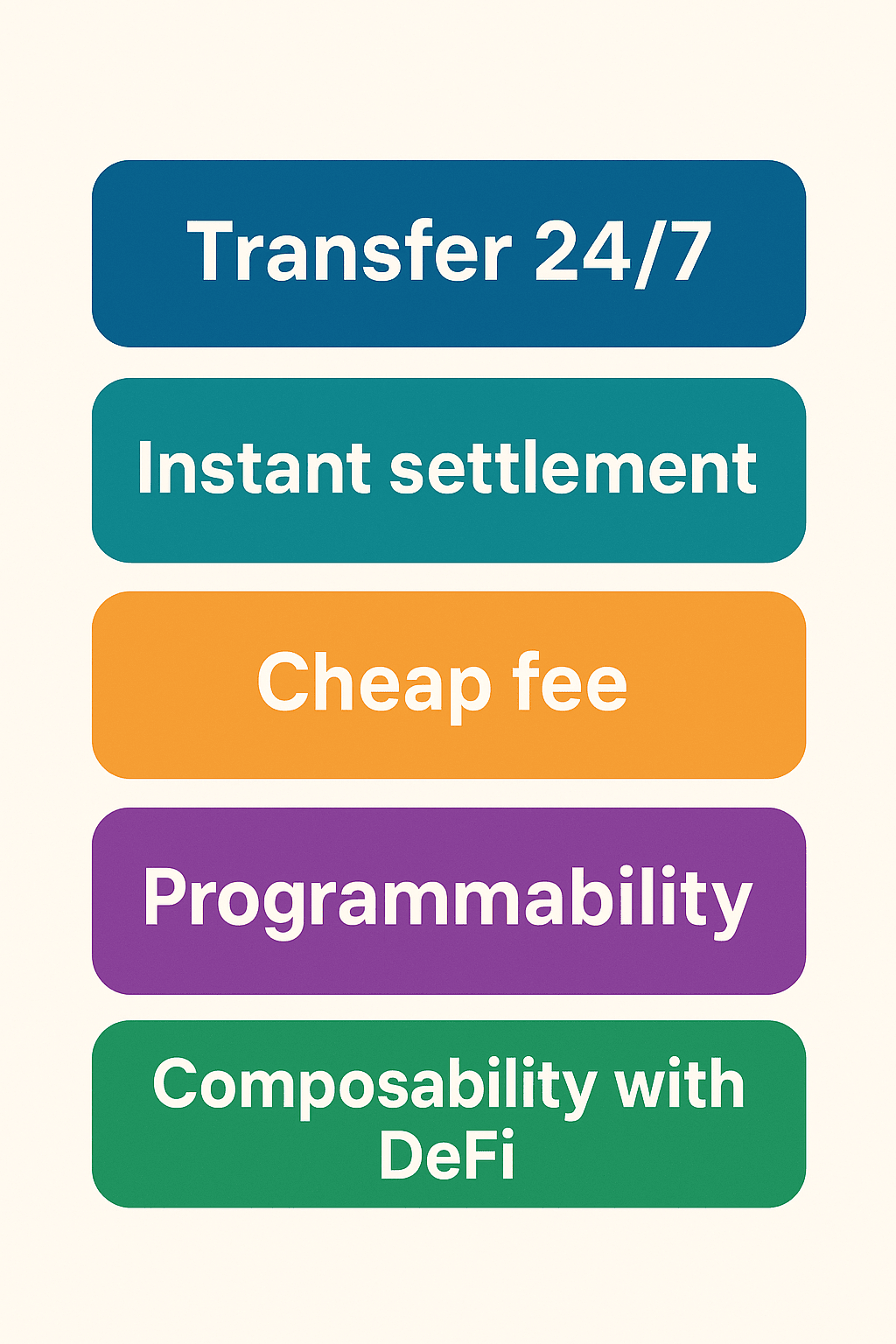 - Transfer 24/7: Blockchain doesn't stop on holidays or weekends.